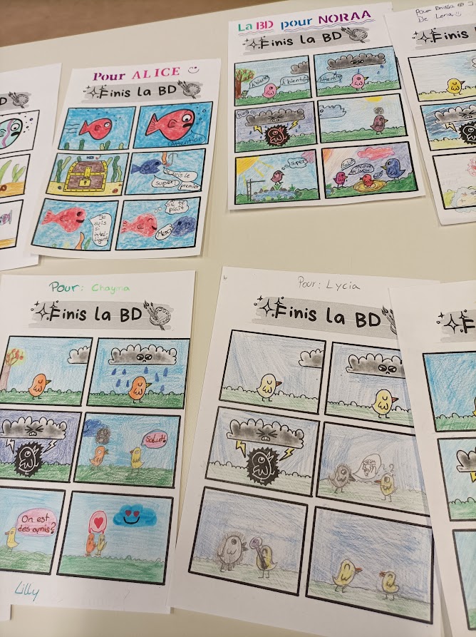 Eine 6. Klasse hat mit ihrer Lehrerin Frau Goltz Comics und Familienstammbäume gestaltet, die einer Partnergruppe im Elsass zugeschickt werden. Die Korrepondenz mit einer französischen Schulklasse ist eine tolle Motivation und wer weiß, vielleicht lässt sich eine persönliche Begegnung organisieren.